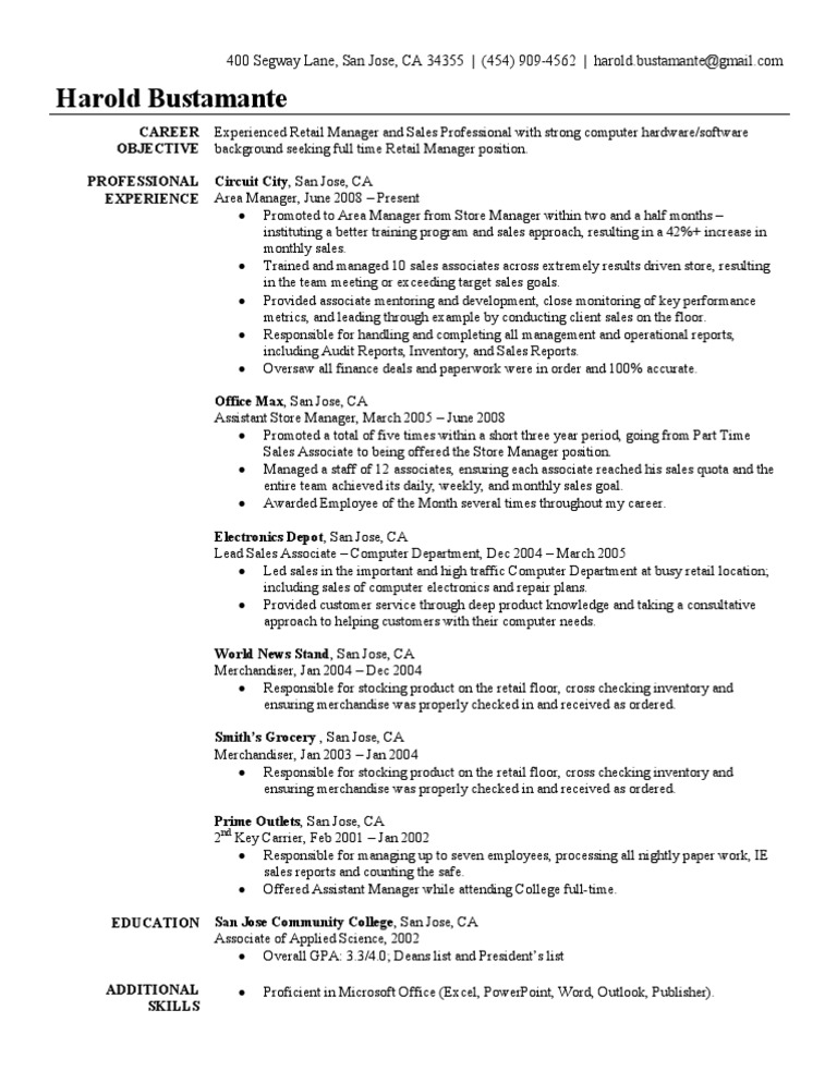 Start your retail sales manager resume with a resume objective or summary. Follow it up with experience and education sections. Put your sales manager resumeskills in a separate key skill section.Add information on your professional sales certifications and membership in professional sales associations and organizations. Area Service Manager Resume Samples 4.8 (44 votes) for Area Service Manager Resume Samples. The Guide To Resume Tailoring. Guide the recruiter to the conclusion that you are the best candidate for the area service manager job. It's actually very simple. Tailor your resume by picking relevant responsibilities from the examples below and then ...